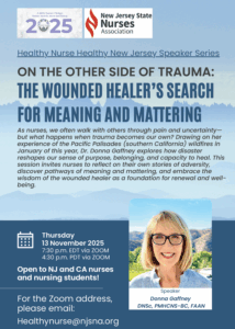 Pull up a chair for our Healthy Nurse Healthy New Jersey Zoom talk on Thursday, November 13th at 7:30 p.m. “On the Other Side of Trauma: the Wounded Healer’s Search for Meaning and Mattering.” Attached is the flyer.